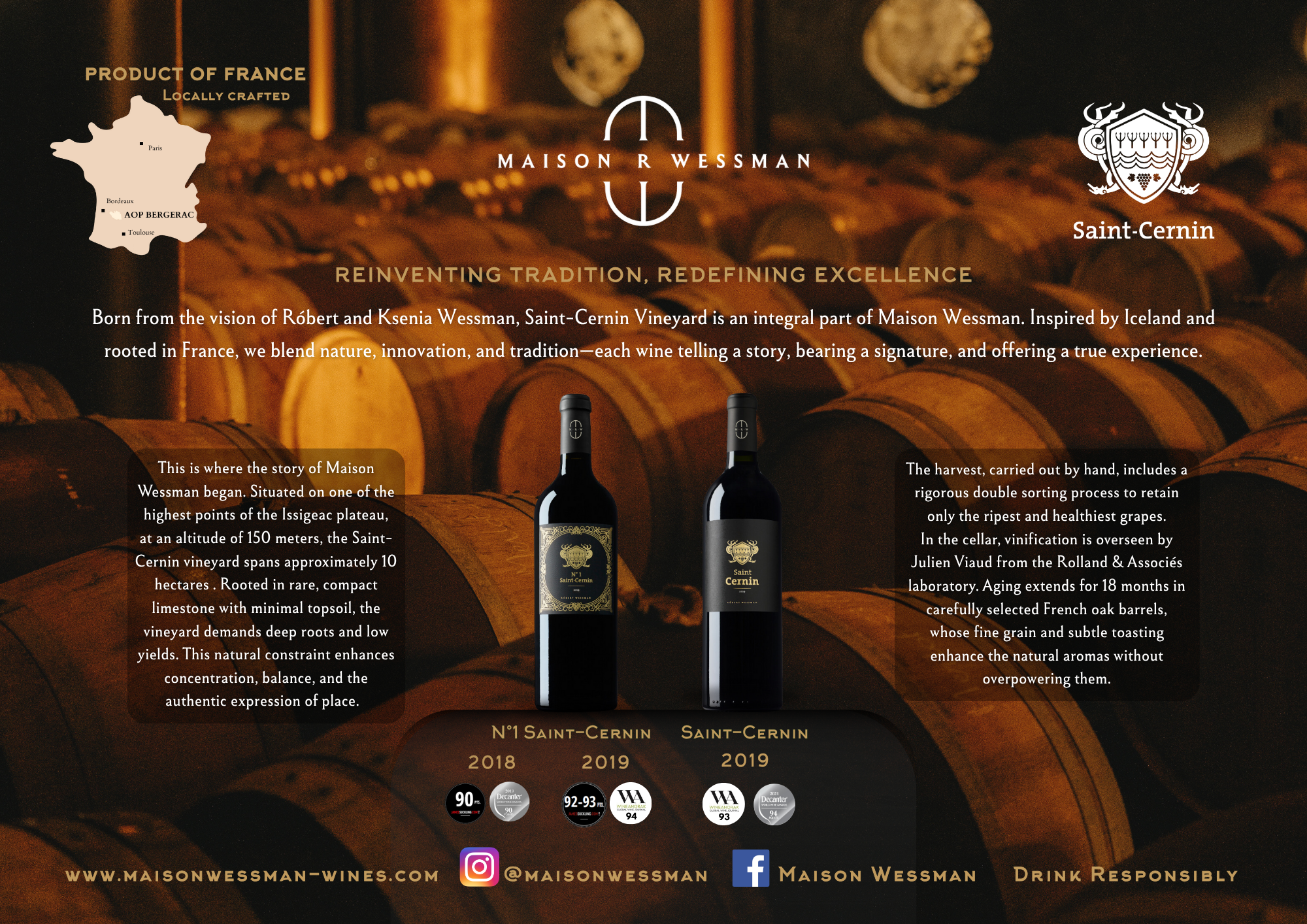 Maison Wessman is a distinguished winery located in the South-West region of France, founded by entrepreneur Robert Wessman and his partner, Ksenia. Known for its blend of tradition and modern craftsmanship, Maison Wessman has quickly become recognized for producing expressive, high-quality wines that reflect both the terroir and the visionary spirit behind the estate.